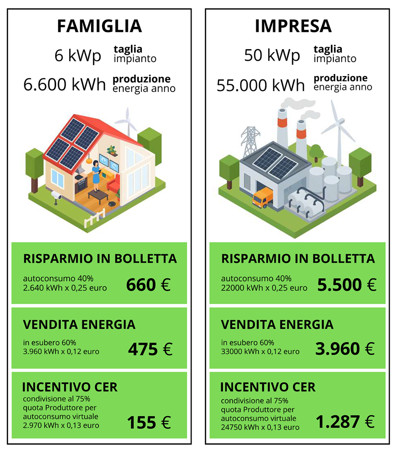 Entrambi ricevono dalla CER un incentivo proporzionale all’energia condivisa all’interno della stessa area (detta cabina primaria).