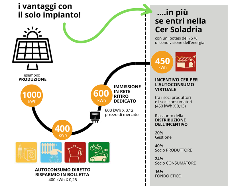 Questa energia, se condivisa all’interno della comunità, viene premiata dal GSE con un incentivo a favore della CER, che lo distribuirà ai propri soci e al Fondo Etico, dopo aver pagato le spese di gestione.